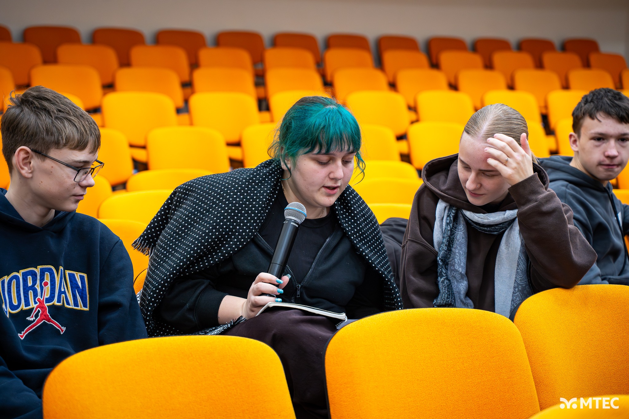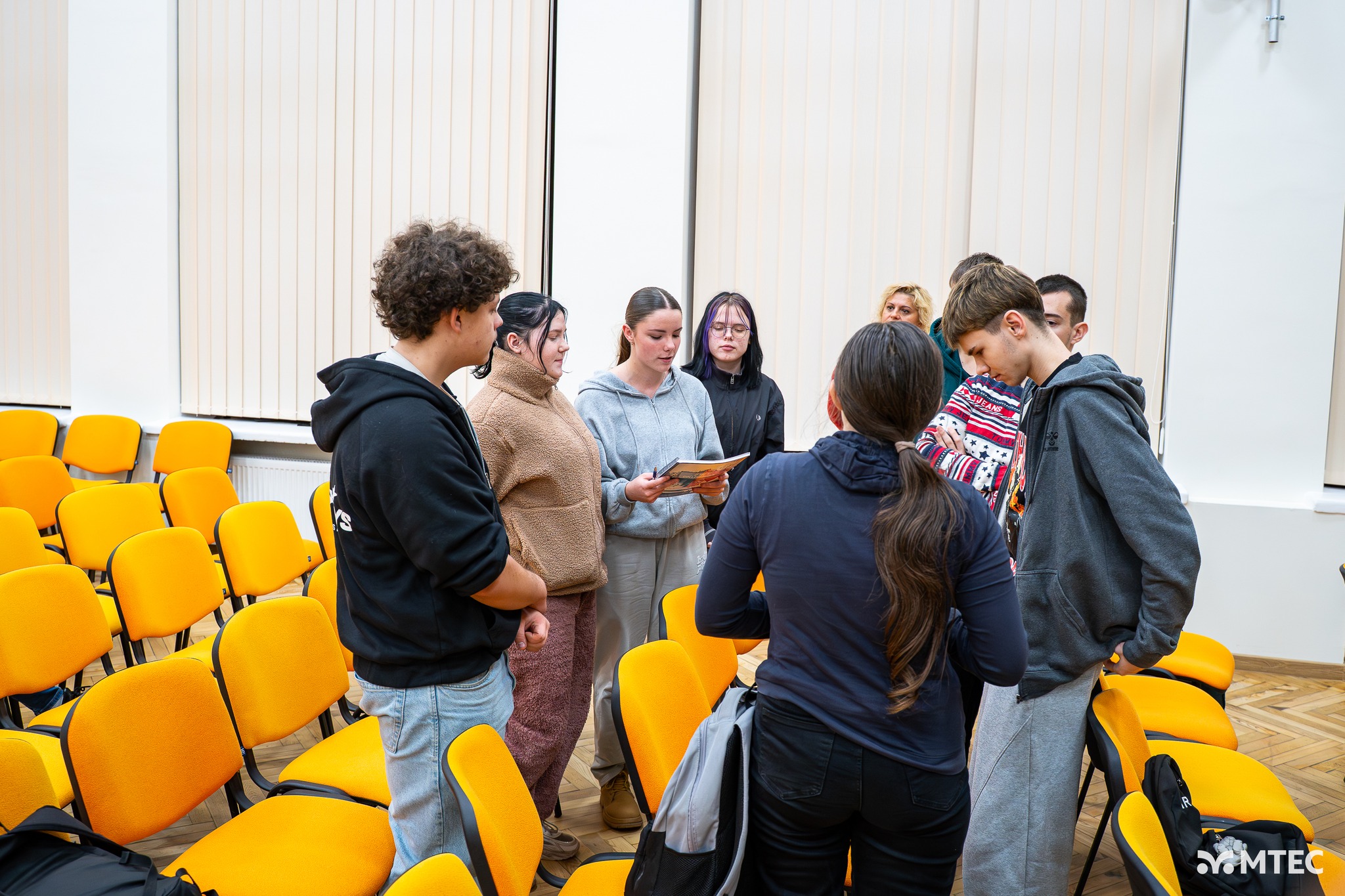 𝐓𝐡𝐞 𝐭𝐡𝐞𝐚𝐭𝐞𝐫—𝐨𝐫 𝐝𝐫𝐚𝐦𝐚—𝐦𝐞𝐭𝐡𝐨𝐝 had already been tested during a meeting of the project's partner teachers. The participating students were divided into groups of 4-5 members, and each group was given a scenario based on everyday life, such as a gym, home, bus, or schoolyard. The task for each group was to discuss and act out a scene incorporating an element of internet addiction. Once prepared, the students performed their scenes for the other participants.